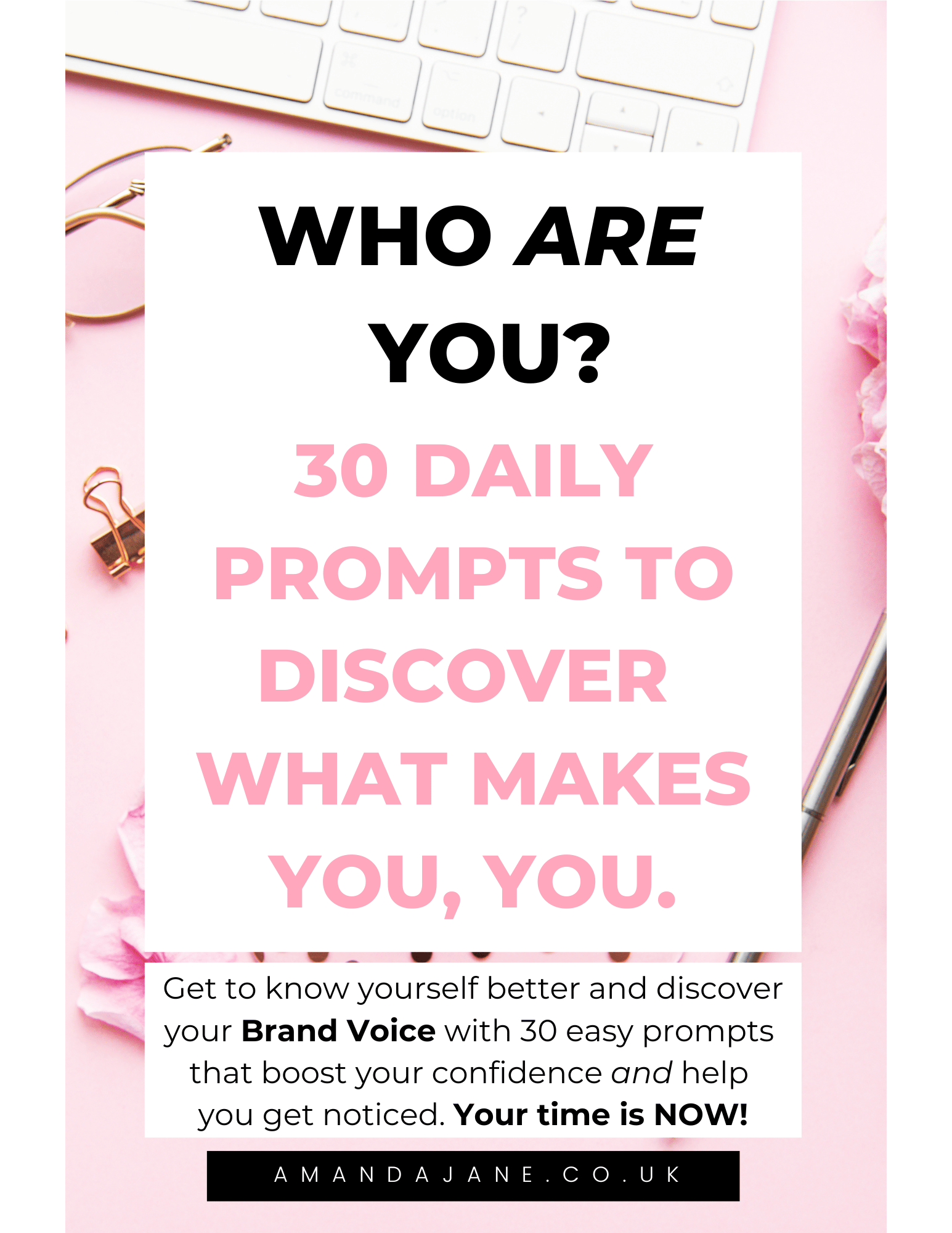 Get to know yourself better and discover your Brand Voice with 30 Daily Prompts To Discover What Makes You, YOU! That boost your confidence and help you get noticed. Your time is NOW!